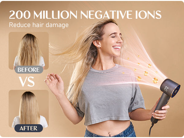 Offers 8+1 combination options, the electronic display screen provides real-time information on temperature and airflow, allowing precise control over the drying process. Releases 200 million negative ions to balance static electricity in the hair and reducing frizz. The built-in intelligent temperature control minimizes heat damage.